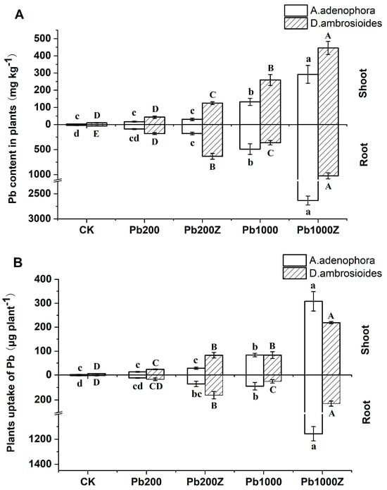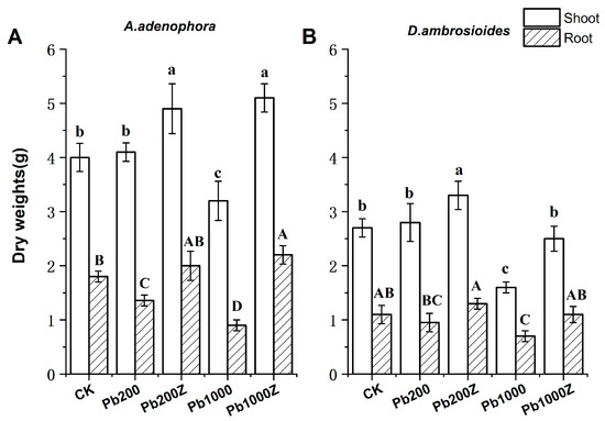 Effects of the endophyte ZYG-4 inoculation on dry weights of plants. (A) Host plant (A. adenophora); (B) Non-host plant (D. ambrosioides). CK, natural soil; Pb200, artificial soil with lead concentration of 200 mg·kg−1; Pb200Z, artificial soil inoculated with ZYG-4 at a lead concentration of 200 mg·kg−1; Pb1000, artificial soil with lead concentration of 1000 mg·kg−1; Pb1000Z, artificial soil inoculated with ZYG-4 at a lead concentration of 1000 mg·kg−1. The Duncan test indicates significant differences (p < 0.05) in dry weights, as denoted by both capital and lowercase letters. Capitals represent variations in root dry weights, while lowercases denote distinctions in shoot dry weights. The vertical bars represent the standard deviation (n = 3).