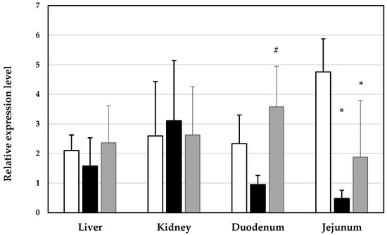 Figure 2. Relative expression levels of ABCC2 mRNA in healthy pigs (white bars); DON-plus-ZEN-treated pigs (black bars); and pigs treated with DON plus ZEN plus mycotoxin binder (Mycofix, gray bars). The expression was normalized against Hypoxanthine-guanine phosphoribosyl transferase (HPRT) and glyceraldehyde3-phosphate dehydrogenase (GAPDH). * statistically significant differences between controls and DON-plus-ZEN-treated animals, with or without Mycofix, at p < 0.05; #—statistically significant differences between groups treated with DON plus ZEN and DON-plus-ZEN-plus-Mycofix-treated animals at p < 0.05.