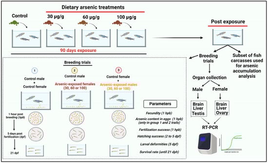 With this background in mind, the present study was designed to understand how chronic exposure to environmentally relevant arsenic exposure via diet affects reproductive performance and early development in fish using zebrafish (Dania rerio) as a model species. The specific objectives of this study were (i) to characterize how maternal or paternal exposure to dietary arsenic affects reproductive performance (egg production and fertilization rate) and early development (rate of hatching success, larval survival, and deformity) and (ii) to elucidate how dietary arsenic exposure affects the expression of HPG-L axis genes in male and female fish. We hypothesized that maternal and paternal chronic exposure to dietary arsenic would impair zebrafish’s reproductive capacity and larval development in a dose-dependent manner.