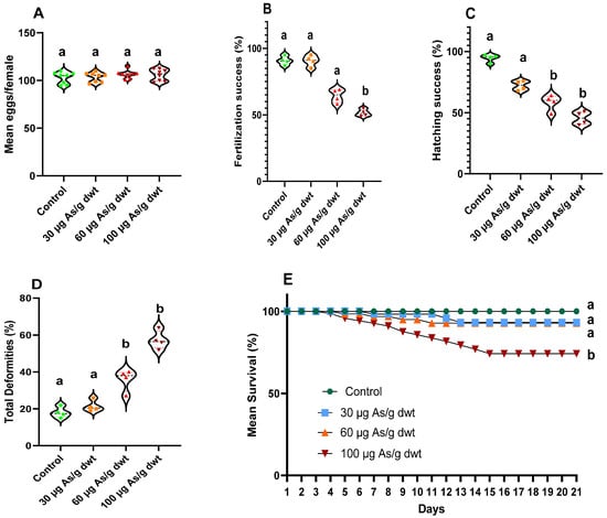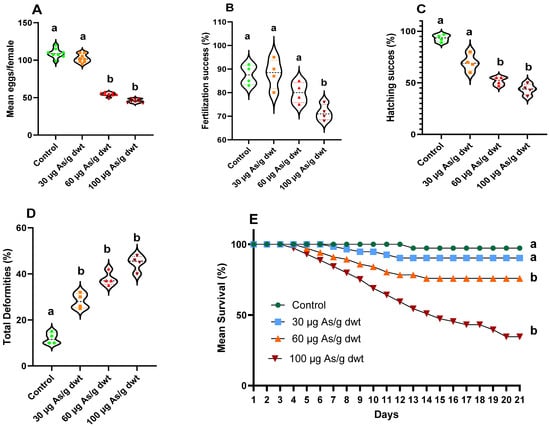 Reproductive and developmental effects of chronic dietary exposure to arsenic in male zebrafish bred with control female zebrafish: (A) mean eggs per female [n = 8 (each replicate represents a breeding trio: one male and two female)], (B) fertilization success (%), (C) hatching success (%), (D) total larval deformities (%), and (E) mean larval survival (%) over 21 days post-hatch. Data presented in plots (B–E) are averages of 4 replicates (n = 4), where each replicate consisted of 100 fertilized eggs. Violin plots show individual data points in different colors and shapes based on the treatment groups, and the width of each plot represents the density of data points along the distribution. The black dotted line in the violin plots indicates the group average, and the different letters above the bars indicate statistically significant differences across different treatment groups (p < 0.05).