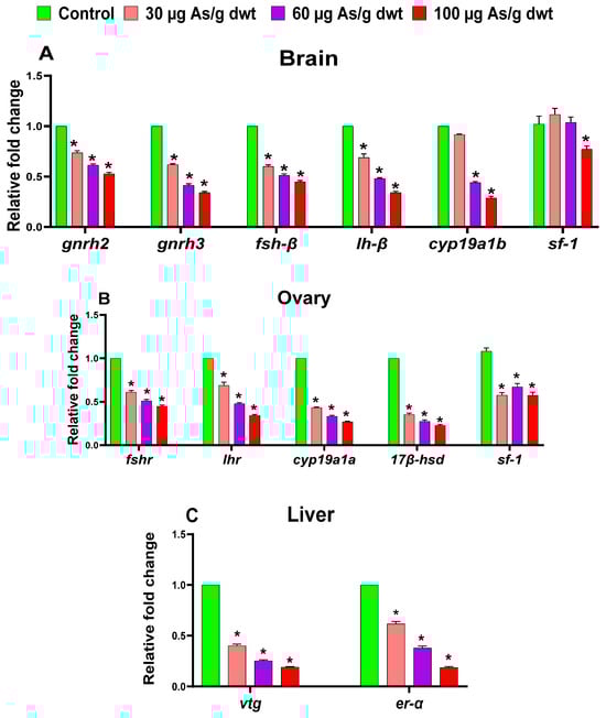 The one-way ANOVA showed that chronic exposure to arsenic resulted in significant reductions in the expression of all the HPG-L axis genes examined in females, including gnrh2 (F3,16 = 200.5, p < 0.0001), gnrh3 (F3,16 = 148, p < 0.0001), fsh-β (F3,16 = 273, p < 0.0001), lh-β (F3,16 = 230.3, p < 0.0001), cyp19a1b (F3,16 = 175.5, p < 0.0001), and sf-1 (F3,16 = 6.45, p = 0.0045) in the brain (Figure 4A); fshr (F3,16 = 235, p < 0.0001), lhr (F3,16 = 216, p < 0.0001), cyp19a1a (F3,16 = 213.6, p < 0.0001), 17β-hsd (F3,16 = 162.6, p < 0.0001), and sf-1 (F3,16 = 45.02, p < 0.0001) in the ovary (Figure 4B); and Vtg (F3,16 = 527.7, p < 0.0001) and ER-α (F3,16 = 282.2, p < 0.0001) in the liver (Figure 4C). Subsequently, Dunnett’s post hoc analysis indicated that the expression of several genes (gnrh2, gnrh3, fsh-β, lh-β, fshr, lhr, cyp19a1a, 17 β-hsd, Vtg, er-α, and sf-1 (ovary)) was significantly downregulated in arsenic-exposed females, irrespective of arsenic concentrations in the diet, relative to the control females (all p < 0.05). In contrast, the expression of the other two genes (cyp19a1b and sf-1 (brain)) was significantly downregulated in females exposed only to medium or high dietary arsenic doses compared to the control females (all p < 0.05).
