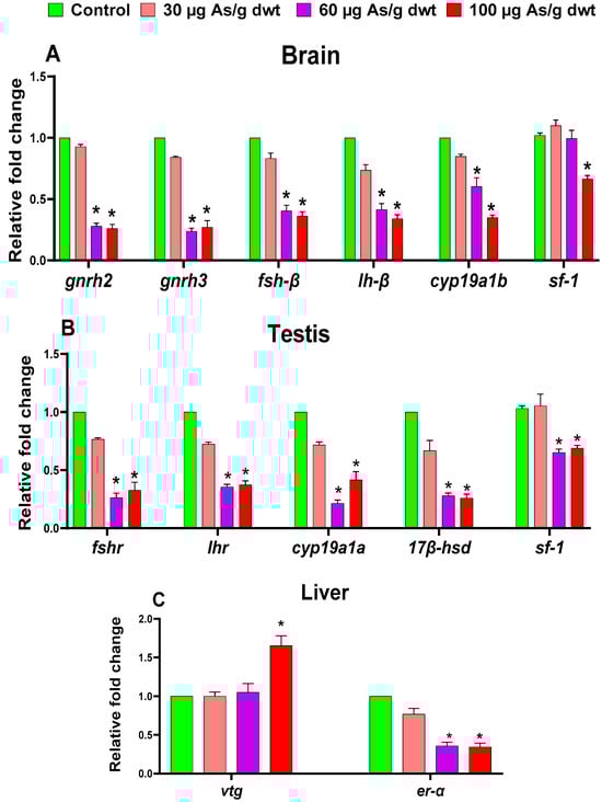 Relative mean fold change in the expression of different HPG-L axis genes in the brain (A), testis (B), and liver (C) of male zebrafish across different chronic dietary arsenic treatment groups. Data are shown as the mean ± SEM (n = 5), and a significant difference (p < 0.05) compared to the control is indicated by an asterisk (*).