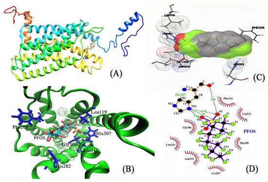The molecular docking of PFOA and GPER. (A) Protein and the ligand. (B) The interacting amino acids on the binding site. (C) Different angles of amino acids at the binding site. (D) Strong interaction between the PFOS ligand and His307.