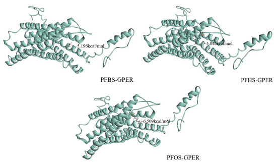 The G protein-coupled estrogen receptor (GPER) is an important protein in the human body and belongs to G proteins [12]. GPER is widely distributed in various organs of the human body, including the ovary, mammary gland, placenta, and uterus. This protein exhibits high affinity and acts as the target for a variety of drugs [13,14]. While traditional theory suggests that GPER ligands bind to extracellular sites, recent studies have demonstrated that when the ligands are fat-soluble substances, GPER and ligands can also interact in the cytoplasm or nucleus, resulting in functional effects [15,16]. PFSAs exhibit profound reproductive and developmental toxicity in organisms, leading to the occurrence of deformities and mortality among offspring. Therefore, it is particularly important to explore the combination mechanism and mode of action between GPER and PFSAs. Studying the combination mechanism of GPER and PFSAs can better predict and assess the biological activity and environmental behavior of these substitutes, which is of significant importance for developing new therapeutic strategies and drug designs.
