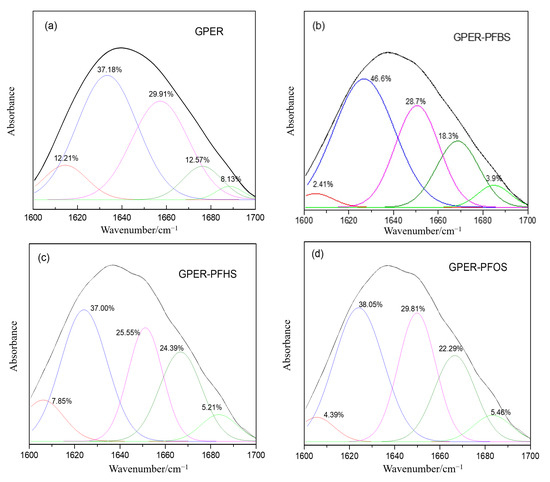 Fourier transform infrared spectroscopy of the percentage composition of secondary structures for free GPER and GPER–PFSA complex systems: free GPER (a), GPER–PFBS (b), GPER–PFHS (c), GPER–PFOS (d).
