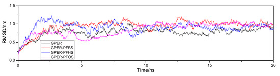The RMSD of free GPER and GPER–PFSA complexes from 20 ns of MD simulations.
