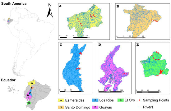 The study focused on five provinces of the Ecuadorian coastal region also known as the littoral region: Esmeraldas, Santo Domingo, Los Ríos, Guayas, and El Oro (Figure 1), with an approximate population of 8.5 million people []. The primary economic activities in the area include agriculture, forestry, and mining. The latter, particularly through the use of mercury for gold recovery, has adverse environmental implications [,]. In the coastal region, there is a mining activity regulation in force that includes the definition/delimitation of primary extraction zones, alluvial extraction zones, and mineral processing zones. The provinces of the coastal region with gold mining areas in each exploitation stage in descending order are: El Oro (n = 231), Esmeraldas (n = 12), Guayas (n = 7), Santo Domingo (n = 3), and Los Ríos (n = 2) [].