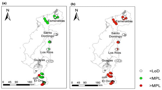 The results show that the concentration of Hg in the province of El Oro was in the range of 0.0007–0.0965 mg/L; 12% of the samples analyzed in this province were below the LoD, while 20% exceeded the MPL for drinking water quality. Regarding the freshwater quality, 88% of the samples exceed the MPL. These results agree with previous studies that reported as the province of El Oro has been severely affected by illegal mining practices, inadequate management of mining waste, and indiscriminate use of Hg in mineral beneficiation activities, mainly in the Zaruma–Portovelo Mining District [,,].