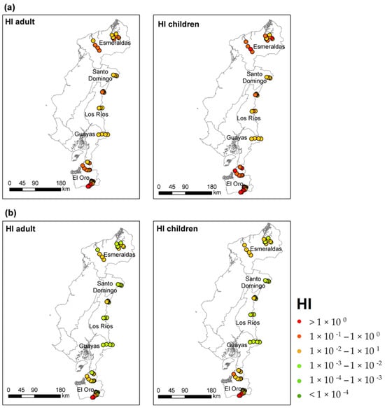 Hazard Index (HI) for receptors exposed to contaminated surface water in the Ecuadorian coastal zone for the following scenarios: (a) residential and (b) recreational.
