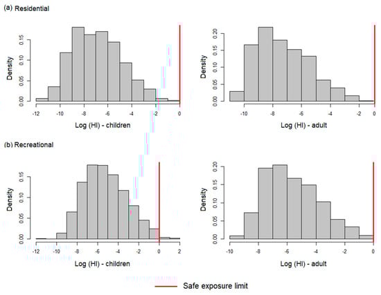 Histogram of HI related to Hg in contaminated surface waters for recipient adults and children in (a) residential and (b) recreational settings. HI values are given in logarithm.