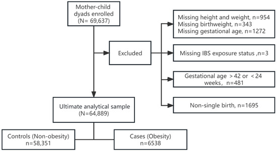 The Longhua Child Cohort Study (LCCS) is an ongoing prospective study that has involved the administration of a population-based survey once a year in the Longhua District of Shenzhen since September 2014. The aim of this study is to examine the influence of environmental factors during a preschooler’s early life on childhood psychobehavioral development. The LCCS recruits children when they enter preschool and invites their mothers to complete a self-administered structured questionnaire every year. A total of 69,637 child–mother dyads were recruited during the LCCS 2021 survey. After excluding children (1) with missing information on important sociodemographic characteristics (i.e., birth weight, gestational age, and present height and weight); (2) whose mothers did not report information of exposure to IBS during pregnancy; and (3) who were nonsingleton births and whose gestational age was low (under 24 weeks) or high (42 weeks or greater) (data from 64,889 (93.2%) child–mother dyads were included in this study (Figure 1)). We employed multiple imputation (MI) to fill in the missing data or outliers for covariates among 8868 (13.7%) participants whose questionnaires did not contain information on at least one chosen covariate.