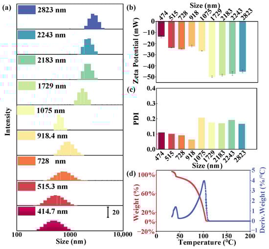 Characterization of prepared polystyrene with different particle sizes. (a) Particle size distribution analysis, (b) zeta potential, (c) PDI, and (d) thermogravimetry analysis of 700 nm polystyrene.