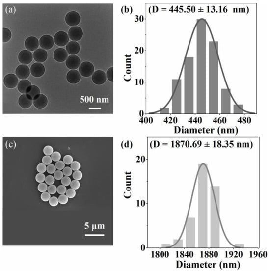 (a) TEM image of 515 nm polystyrene; (c) SEM images of 1729 nm polystyrene; (b,d) are grain size distribution histograms of (a,c), respectively, by ImageJ.
