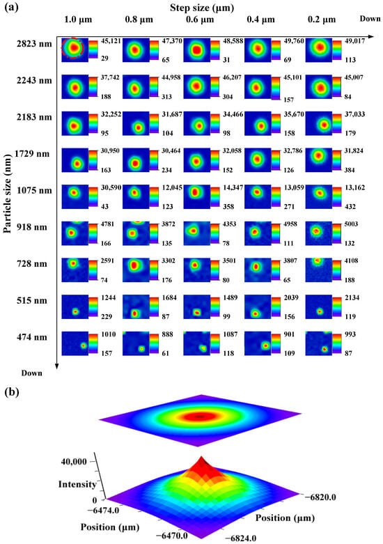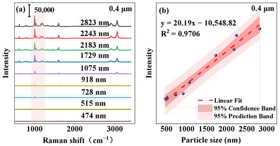 Under identical step sizes, Figure 4 presents the average Raman spectra of polystyrene across varying particle sizes, showing a clear linear relationship between polystyrene particle size and Raman intensity at 1002 cm−1 (assigned to the aromatic ring’s breathing vibration showed in Table S4). The R2 values, ranging from 0.9551 to 0.9706 at different step lengths, indicate a robust linear correlation.