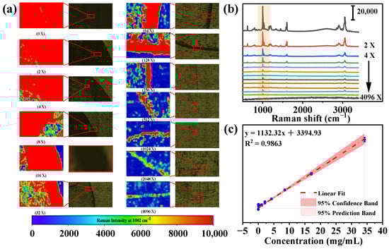 (a) Microscopic images and Raman mapping images of 700 nm polystyrene in different concentration ranges, (b) average Raman spectrum of 700 nm polystyrene across various concentration ranges using a two-fold dilution method, and (c) standard calibration curves of polystyrene with different concentrations.