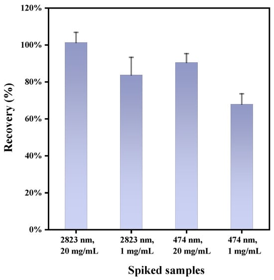 Spiking involved testing large-diameter polystyrene (2823 nm) at high and low concentrations (20 mg/mL; 1 mg/mL), and small-diameter polystyrene (474 nm) under similar concentration conditions. By utilizing the developed method for visual and quantitative identification of polystyrene via Raman imaging, concentration detection and recovery rates were assessed. For large particles (2823 nm), average recovery rates were 101.33% (RSD 5.4%) at high concentrations and 83.81% (RSD 11.2%) at low concentrations. For small particles (474 nm), the rates were 90.53% (RSD 5.3%) at high concentrations and 68% (RSD 8.2%) at low concentrations. The variations in recovery rates could be due to calcium-containing soaps forming on filter membranes and the yogurt matrix’s effect. Low-concentration, small polystyrene particles, when dispersed in a large sample (139 g), are difficult to enrich and distribute unevenly on the membrane. Conversely, high-concentration polystyrene forms distinct coffee rings, yielding improved quantification, as depicted in Figure S10. In subsequent work, we synthesized Fe3O4@PEI@Ag nanomagnetic beads to enrich low-concentration polystyrene, addressing the aforementioned limitations. Da Costa Filho employed alkaline digestion and filtration steps, identifying microplastics as small as 5 µm in milk using Raman microscopy and SEM, with recovery rates ranging from 78–141% []. In our study, the digestion step was simplified and efficient, yielding favorable recovery rates of 68–101.33% (Figure 6).