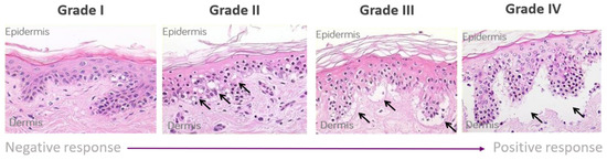 The 4 mm skin biopsies, obtained from volunteers, were cut into multiple smaller sections of approximately 1 mm2 for analysis. Each test condition utilized 1 piece of 1 mm2 of healthy skin from each volunteer. Skin biopsy sections were incubated in a medium supplemented with autologous, heat-inactivated serum containing both 1 × 106 PBMCs/well and treated mAb samples at a concentration of either 1 or 10 µg/mL for 3 days at 37 °C, 5% CO2, 95% humidity. Skin biopsies were then fixed in formalin prior to being paraffin-embedded, sectioned, and stained with haematoxylin and eosin (H&E). Negative controls consisted of co-culture of PBMCs and autologous skin alone and co-culture of the skin with the isotype antibody IgG1. The positive control was OKT3, which has previously been shown to give rise to grade II or III response in skin explant assays [34] Controls were included in all assays. The endpoint of the assay was the assessment of the histopathological damage observed in the skin tissue caused by exposure to the mAb sample. This output was measured as skin grades (grades I to IV) according to the severity of the skin tissue damage observed (Figure 1) [35]. Grade I is considered negative, with an intact upper keratinocyte layer. Grade II includes dyskeratosis and vacuolization of the epidermis and dyskeratotic bodies. Grade III shows more severe damage to the epidermal layer, with the initial separation of the epidermal and dermal layers observed as cleft formation. Grade IV refers to severe damage, with complete separation of the epidermal and dermal layers. Grade II or higher is regarded as a positive response. Grading was performed blind by 2 individual assessors.