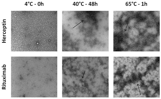 Visual characterization of two heat-stressed mAb samples by Transmission Electron Microscopy (TEM). Comparison of aggregation status of two mAbs, Rituximab and Herceptin, after a heat stress protocol. Increased aggregation highlighted by arrows is shown in heat treated conditions from 4 to 65 °C.