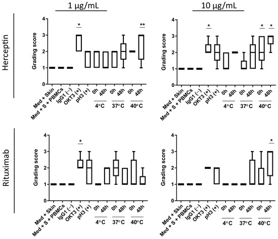 Skin explant assay results from exposure to heat-stressed mAb samples. Heat-stressed samples of Herceptin and Rituximab (1 and 10 µg/mL) were incubated with peripheral blood mononuclear cells (PBMCs) and autologous skin biopsies from healthy donors (n = 5) in the skin explant assay. The severity of the histopathological damage was graded using Lerner grades I–IV) Based on the damage observed, the boxes represent the median in the 25th and 75th percentiles with min and max whiskers. A significant increase (** p < 0.005 and * p < 0.05) in tissue damage response was observed at 1 μg/mL and 10 μg/mL Herceptin when compared to the negative control (skin in medium alone) at the 40 °C/48 h testing condition. Rituximab showed significant tissue damage at 40 °C/48 h when compared to the negative control (* p < 0.05). The data were assessed by one-way ANOVA and Bonferroni’s post-hoc test.