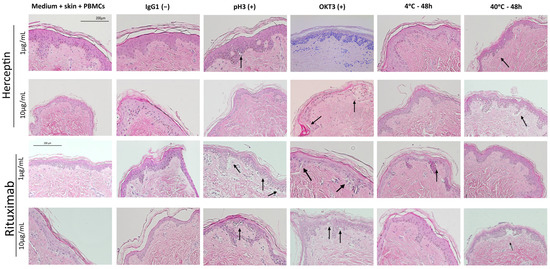 Histopathological damage from exposure to heat-stressed mAb samples. H&E staining of skin tissue after incubation with the heat-stressed samples (60 °C, pH3) of Herceptin and Rituximab at 1 and 10 µg/mL. Black arrows represent histopathological damage on the dermal/epidermal junction in the form of vacuolization of keratinocytes (Grade II positive reaction) and cleft formation leading to separation of the dermis and epidermis (Grade III positive reaction). Scale bars represent 200 µm.
