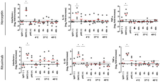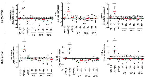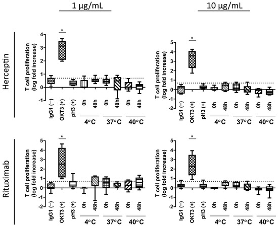 T-cell proliferation assessment resulting from exposure to heat-stressed mAb samples. Heat-stressed samples of Herceptin and Rituximab (1 and 10 µg/mL) were incubated with donor-derived PBMC (n = 5 for each condition). T-cell proliferation assessment alone was not capable of detecting an increased immunological profile induced through protein aggregation. The boxes represent the median with the 25th and 75th percentile with min and max whiskers. * p < 0.05 Bonferroni’s post-hoc test after One-way ANOVA. The log 2-fold positive threshold is indicated by the dotted line.