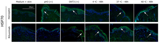 Heat shock protein 70 (HSP70) serves as a molecular chaperone in cases of cell stress (as heat shock or oxidative stress). HSP70 is crucial for cell survival after apoptotic stimuli [39,40], as shown by Mosser et al. [40] in which macrophages heat-stressed for up to two hours at 43 °C, showed protection of DNA fragmentation in the presence of HSP70 [39]. HSP70 was shown to be significantly upregulated in all treated samples and absent in negative controls. This suggests that some level of inflammatory stress was being imparted throughout the assay conditions. HSP70 is most likely involved in the protein refolding after exposure to the aggregated Herceptin and Rituximab, and its overexpression may rescue cells from apoptotic cell death. Skin explant assay samples were tested at 4 °C, 37 °C and 40 °C temperature conditions. Centrifugal analysis of aggregate formation at these temperatures only showed relatively moderate changes in aggregated antibody levels with the vast majority of mAbs still present in the monomer formation. This suggests that, at best, only a mild immune stimulatory effect would be observed and that this, alongside HSP70’s anti-apoptotic effects, may partly explain why mild histological damage was observed in aggregated antibody-treated conditions.
