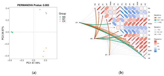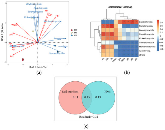 K. paniculata not only avoided the imbalance of fungal communities in the manganese slag but also increased the number and relative abundance of dominant genera. The Mantel test further verified the above view, where the fungal community in CK was strongly correlated with multiple soil nutrient indicators, and the fungal community underwent long-term natural selection of oligotrophy and heavy metal stress, and was insensitive to HMs while being highly sensitive to nutrient deficiencies. The fungal community in M0 was mainly affected by the content of HMs, TP, TK, AN, AP and AK, while the addition of organic fertilizers brought about nutrient abundance, leading to the overgrowth of a single species but also reducing the adaptation ability of the fungal community to heavy metal stress. However, the structure of the fungal community in M1 was only significantly affected by pH, indicating that the soil quality was improved, nutrients were more abundant, and the adaptation ability of the fungal community to HMs was enhanced, resulting in a more stable community structure.