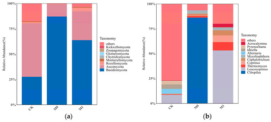 17]. In contrast to other studies’ results, in our study, the abundance and diversity of fungal species in the untreated manganese slag (CK) were the highest. Adding the amendments alone (M0) led to a sharp decrease in fungal species abundance and diversity, while adding the amendments and planting