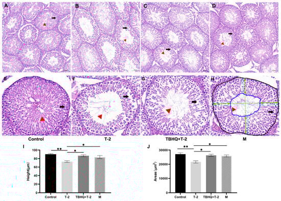 tBHQ alleviates T-2 induced testicular injury. (A–D) are at 200× magnification, with a scale bar of 100 μm, while (E–H) are at 400× magnification, with a scale bar of 50 μm. (A,E) represent the control group, (B,F) represent the T-2 group, (C,G) represent the tBHQ+T-2 group, and (D,H) represent the M group. Testicular tissue sections stained with hematoxylin and eosin (HE) were observed under a light microscope. In the control group, germ cells were orderly arranged in various layers, with thick walls of the convoluted seminiferous tubules and abundant spermatozoa in the tubular lumens at the locations indicated by the red-boxed triangles in (A,E). Conversely, in the experimental groups, germ cells were loosely arranged and disorganized, with thinning walls of the convoluted seminiferous tubules and reduced numbers of mature spermatozoa in the tubular lumens at the locations indicated by the red-boxed triangles in (B–D,F,H). Under high magnification, observations of the T2 group revealed basal membrane disruptions in the walls of the convoluted seminiferous tubules (indicated by the black arrow in (B)), with numerous germ cells being detached from the tubular lumens (indicated by the black arrow in (F)), and the black-lined area in (H) defines the cross-sectional area of the convoluted seminiferous tubules. The area within the blue lines defines the luminal area. The average length of the four green double-headed arrows represents the height of the germinal epithelium. (I) Cross-sectional area of the convoluted seminiferous tubules. (J) Height of the convoluted seminiferous tubules. n = 8. * represents a significance difference, with p < 0.05. ** represents a significance difference (p < 0.01).