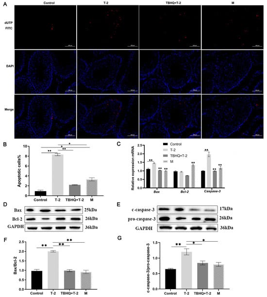 It is evident that T-2 treatment significantly augments the apoptosis of testicular tissue cells at the cellular level. Notably, administration of tBHQ, either as a preventive measure or therapeutic intervention, markedly mitigates testicular cell apoptosis (Figure 2A,B, p < 0.05). At the molecular level, T-2 induces a substantial increase in the ratio of BAX to BCL2, along with elevated mRNA and protein expression levels of caspase-3 (Figure 2C–G, p < 0.05).