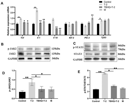 tBHQ alleviates the inflammatory response induced by T-2. (A) mRNA expression levels of inflammatory factors; (B,D) protein expression levels and phosphorylation of JAK, represented by grayscale values; (C,E) protein expression levels and phosphorylation of STAT3, represented by grayscale values. n = 8. * represents a significant difference, with p < 0.05. ** represents a significant difference, with p < 0.01.