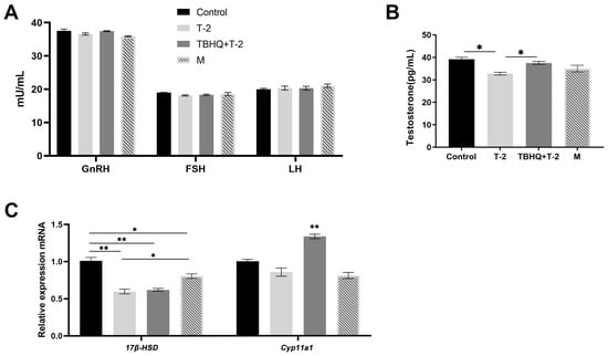 T-2 had no significant impact on GnRH, FSH, and LH concentrations in rat serum (Figure 4A, p > 0.05). However, it significantly decreased the level of testosterone in rat serum (Figure 4B, p < 0.05). Administration of tBHQ, a preventive measure, alleviated the adverse effects of T-2. Analysis of testosterone synthesis gene expression in rat testes revealed a significant elevation in the mRNA levels of 17β-HSD in group M and Cyp11a1 in the tBHQ+T2 group upon administering the tBHQ treatment (Figure 4C).