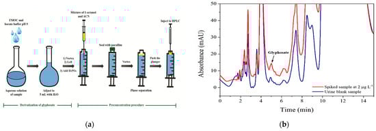 (a) Schematic diagram illustrating in-syringe-based DLLME for the extraction of glyphosate; (b) chromatograms of urine samples; blank sample (blue) and spiked sample (red) with 2 µg/L of glyphosate.