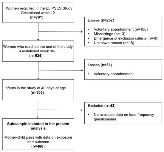 Among the initial 791 recruited women, 534 women completed the study. Then, neurodevelopment was assessed in 503 infants. Out of these, 460 mother–child pairs had information on both the maternal food frequency questionnaire and the assessments of infant neurodevelopment included in the present study (Figure 1).