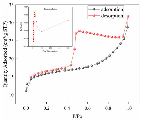 BET is important for evaluating the specific surface area and pore structure of materials; thus, nitrogen adsorption/desorption isotherm experiments of GO were conducted under 77 K. The nitrogen adsorption/desorption isotherm curve of GO is shown in Figure 2. Based on the Brunauer–Emmett–Teller method, the specific surface area of GO was calculated to be 58.95 m2/g. The isotherm curve of GO shown in Figure 2, which exhibited a typical type-IV curve with an H4 hysteresis loop, indicates that GO presented a mesoporous structure. The inset in Figure 2 showed the pore size distribution curve of GO based on BJH calculation, and it indicated that there were small mesoporous pores (7–12 nm) primarily in GO, and the pore size distribution was not uniform. The pore distribution of CS-GO (10:1) was not measured due to the small specific surface area, which indicated that the physical adsorption capacity of the material was unsatisfactory.