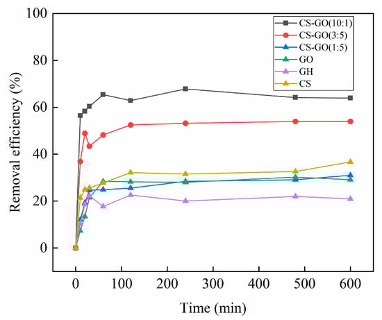 Due to the electron-friendly characteristics of the OBS terminal group, improving the functional group’s affinity between adsorbents and OBS might enhance the OBS removal efficiency. Therefore, diverse functional groups of adsorption materials were investigated for the adsorption capacity of OBS in this study, including CS-GO (10:1), CS-GO (3:5), CS-GO (1:5), GO, and GH. As shown in Figure 4, the OBS removal efficiency of CS-GO (10:1) was significantly superior to CS, GO, and GH. The OBS removal efficiencies of CS-GO (10:1), CS-GO (3:5), CS-GO (1:5), CS, GO, and GH were 60.3%, 43.4%, 24.6%, 25.7%, 21.5%, and 22.3% at 30 min, respectively. This phenomenon showed that the adsorption capacity of material on OBS was gradually improved with the increase in chitosan content, which might be related to the increasing quantities of amino groups in the composite with the addition of CS. In general, the negatively charged groups of -COO or -SO3− of PFAS take electronic attraction with the positively charged -NH3+ [35,36]. Therefore, the electrostatic force between the material and anion OBS would greatly promote the adsorption efficiency. CS-GO (10:1) presented the fastest removal efficiency of 58.3% for OBS in the initial 20 min, and reached an equilibrium within 2 h, with a removal efficiency of 65.4%. This phenomenon might be related to the increased electrostatic interaction due to the positive charge of the material group [28]. However, GH and GO did not present a significant performance due to the absence of electrostatic interaction. The adsorption mechanism of GO depends on hydrogen bonding and π–π interactions, while GH depends on hydrophobic and π–π interactions according to previous studies [37,38,39]. Therefore, the adsorption material was chosen as CS-GO (10:1) in the subsequent study.