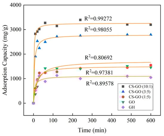 In order to further investigate the control mechanism in the process of OBS adsorption by diverse materials, pseudo-first-order and pseudo-second-order kinetic models were employed to fit the OBS adsorption. As shown in Figure 5, the adsorption capacity of OBS on the five materials involving CS-GO (10:1), CS-GO (3:5), CS-GO (1:5), GO, and GH gradually increased over time, and the adsorption reached equilibrium within 4 h. CS-GO (10:1) exhibited the maximum equilibrium adsorption capacity of 3196.8 mg/g among the five materials. All fitting results are shown in Table 2. The R2 of OBS adsorption by the three composite materials of CS-GO from the pseudo-first- and pseudo-second-order kinetics all exceeded 0.95, indicating that both chemical adsorption and physical adsorption were altogether involved in the adsorption process. The pseudo-second-order kinetic model could better fit the OBS adsorption data of the three composite materials, and the regression coefficients R2 were 0.9927, 0.9806, and 0.9738, respectively. It was demonstrated that the adsorption process of CS-GO was mainly controlled by chemical adsorption. Moreover, the OBS adsorption data from GO and GH were well-fitted with the pseudo-first-order kinetic model, indicating that the adsorption rate was controlled by the diffusion step in the adsorption process. In addition, according to the k value of the pseudo-second-order kinetics, CS-GO (10:1) presented the maximum adsorption rate constant among the above five materials, followed by CS-GO (3:5) and CS-GO (1:5), and GO expressed the slowest adsorption rate.