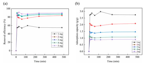The influence of adsorbent dosages on OBS removal efficiency (a) and adsorption capacity (b) (temperature: 25 °C; initial concentration: 50 mg/L; solution volume: 100 mL).