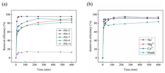 The OBS adsorption influence of solution pH (a), and different cations (b) (temperature: 25 °C; initial concentration: 50 mg/L; ratio of sample mass: 20 mg/L; solution volume: 100 mL).