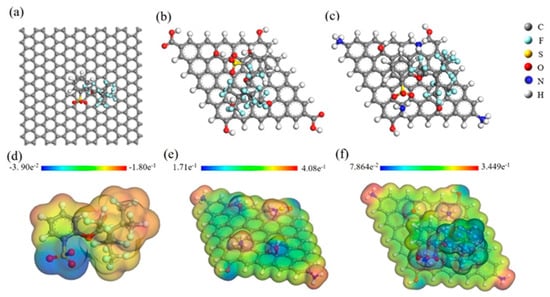 Therefore, the electrostatic potential (ESP) of CS-GO before and after adsorption was further investigated using DFT. As shown in Figure 8d, all atoms of OBS were negatively charged with the range from −3.9 × 10−2 to −1.8 × 10−1. The most active site of OBS was a sulfonic terminal group with a high negative charge, which could cause nucleophilic attacks with adsorbents. Figure 8e showed that the CS-GO surface was positively charged, and the amino groups exhibited the maximum positive charge which attracted OBS effectively. The ESP simulations after adsorption are shown in Figure 8f. For CS-GO-OBS, the ESP still showed a positive charge constantly, but the positive charge density of the amino group decreased due to the neutralization with negative charges of the sulfonic acid group.