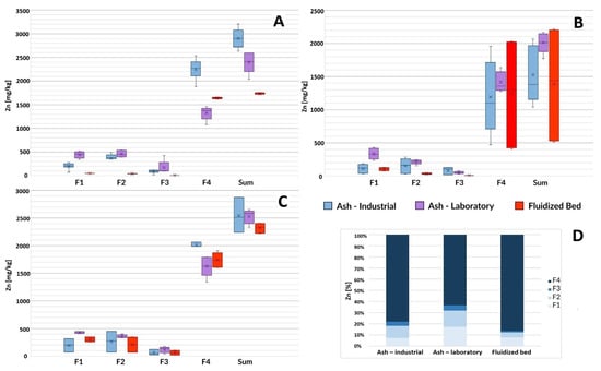Zinc content in ash samples from three wastewater treatment plants based on the sludge incineration method (laboratory furnace or industrial installation) and in disposed fluidized beds. F1—ion exchange and carbonate fraction, F2—fraction associated with Mn and Fe oxides (reducible), F3—organic and sulfide fraction, F4—residual fraction, Sum—the total content of the element. (A) GOŚ Łódź, (B) Gdańsk Wschód, (C) GOŚ Dębogórze, (D) percentage fraction by material type (average of all treatment plants).