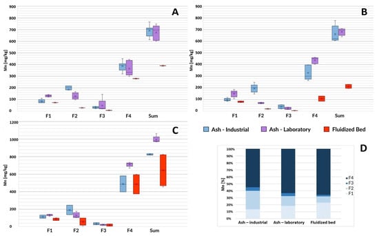 Under the conditions of the second stage of extraction, these compounds may undergo reduction, and then manganese enters the solution in the form of Mn2+ ions []. However, this hypothesis requires confirmation using screening speciation, which allows for the unambiguous determination of the chemical species mentioned. The tested samples of fluidized beds were characterized by a lower total manganese content in relation to ash (on average 1.8, 3.1, and 1.3 times lower for samples from Gdańsk Wschód, GOŚ Łódź, and GOŚ Dębogórze, respectively), with a relatively high share of ion exchange fraction (F1) and a very low content of F2 and F3 fractions compared to ash obtained on an industrial scale (Figure 2D). The percentage of mobile F1 and F2 manganese fractions in laboratory ash (18% and 14%, respectively) was more similar to the characteristics of fluidized beds (23% and 9%, respectively) than I-SSA (14% and 26%, respectively).
