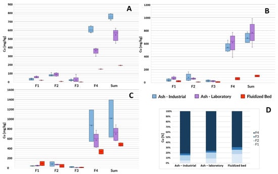 Copper content in ash samples from three wastewater treatment plants based on the sludge incineration method (laboratory furnace or industrial installation) and in disposed-of fluidized beds. F1—ion exchange and carbonate fraction, F2—fraction associated with Mn and Fe oxides (reducible), F3—organic and sulfide fraction, F4—residual fraction, Sum—the total content of the element. (A) GOŚ Łódź, (B) Gdańsk Wschód, (C) GOŚ Dębogórze, (D) percentage fraction by material type (average of all treatment plants).