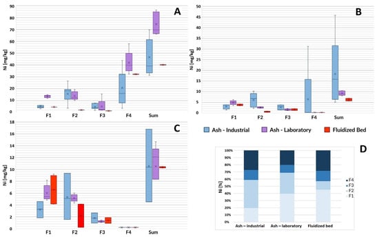 Nickel content in ash samples from three wastewater treatment plants based on the sludge incineration method (laboratory furnace or industrial installation) and in disposed-of fluidized beds. F1—ion exchange and carbonate fraction, F2—fraction associated with Mn and Fe oxides (reducible), F3—organic and sulfide fraction, F4—residual fraction, Sum—the total content of the element. (A) GOŚ Łódź, (B) Gdańsk Wschód, (C) GOŚ Dębogórze, (D) percentage fraction by material type (average of all treatment plants).
