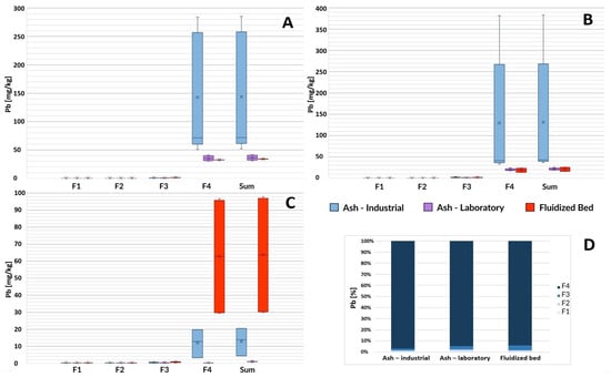 Lead content in ash samples from three wastewater treatment plants based on the sludge incineration method (laboratory furnace or industrial installation) and in disposed fluidized beds. F1—ion exchange and carbonate fraction, F2—fraction associated with Mn and Fe oxides (reducible), F3—organic and sulfide fraction, F4—residual fraction, Sum—the total content of the element. (A) GOŚ Łódź, (B) Gdańsk Wschód, (C) GOŚ Dębogórze, (D) percentage fraction by material type (average of all treatment plants).