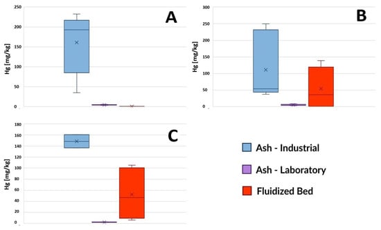 Total mercury content in ash samples from three wastewater treatment plants, based on the method of sludge incineration (laboratory furnace or industrial installation) and in disposed-of fluidized beds. (A) GOŚ Łódź, (B) Gdańsk Wschód, (C) GOŚ Dębogórze.