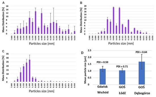 Figure 7 presents the particle diameter distributions of the tested samples of laboratory ash obtained with the use of sieve analysis. In the case of L-SSA from the sewage treatment plants Gdańsk Wschód and GOŚ Łódź, particles of similar sizes were observed, mostly in the range of 0.315 to 0.800 mm. As in the case of the analysis of textural properties, the characteristics of the samples from GOŚ Dębogórze were different. Here, the dominant particle diameters were in the range of 1.25–4.00 mm. A probable explanation for this phenomenon may be technological differences between the wastewater treatment plants at the stage of the preparation of sludge for incineration (dewatering, drying, granulation). In the case of I-SSA, this parameter may also have been significantly affected by the quality of the fluidized bed (diameter of its particles) and the specifics resulting from the technology of the dust collection system used.