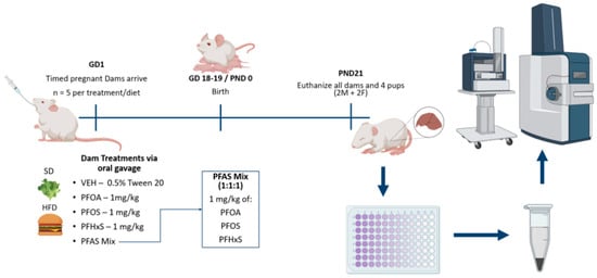 Treatment Paradigm. Timed pregnant CD-1 dams were administered either VEH, PFOA (1 mg/kg), PFOS (1 mg/kg), PFHxS (1 mg/kg), or a PFAS Mix (1 mg/kg PFOA, PFOS, and PFHxS) and then assigned to standard rodent diet (SD) or 60% kCal high fat diet chow (HFD). Protein was then isolated and digested from liver tissue, followed by mass spectrometry for proteome measurement. Treatments included: VEH SD (n = 10), PFOA SD (n = 10), PFOS SD (n = 8), PFHxS SD (n = 8), PFAS mix SD (n = 6), VEH HFD (n = 10), PFOA HFD (n = 12), PFOS HFD (n = 6), PFHxS HFD (n = 10), PFAS mix HFD (n = 8). Figure was made with BioRender (https://www.biorender.com/, accessed on 27 April 2024).