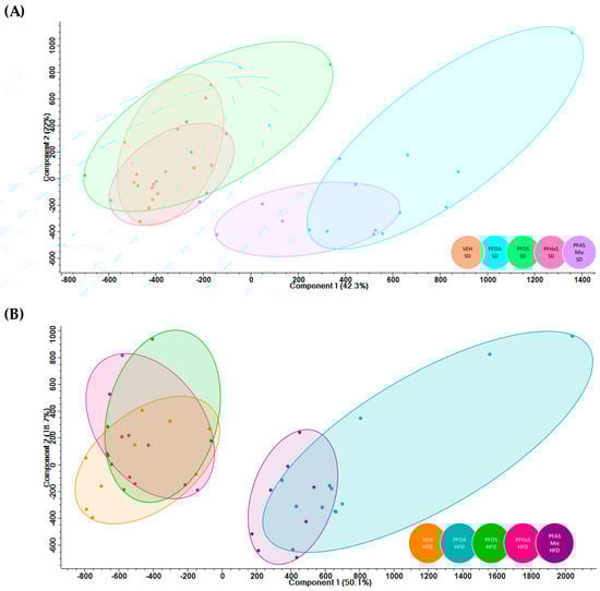 PFOA and PFAS Mix treatments (both SD and HFD) cluster separately from VEH, PFOS and PFHxS (both SD and HFD) treatment groups for offspring liver. (A) Standard Diet. (B) High-fat Diet.