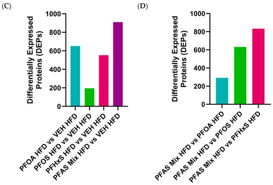 The PFOA SD versus VEH SD and PFAS Mix SD versus VEH SD comparisons visualized in Figure 3A both show a large sum of differentially expressed protein (DEPs) observed, as compared to the PFOS SD versus VEH SD and PFHxS SD versus VEH SD comparisons. PFOA SD versus VEH SD had 978 DEPs, PFOS SD versus VEH SD resulted in 356 DEPs, PFHxS SD versus VEH SD had 378 DEPs, and the PFAS Mix SD versus VEH SD revealed 879 DEPs. Figure 3B compares the individual PFAS within the PFAS mixture in mice fed a SD, with PFHxS SD having the highest number of proteins commonly observed, followed by PFOS SD, then PFOA SD. A similar trend is observed in Figure 3A, with PFOA and the PFAS Mix observed in Figure 3C looking into the HFD more specifically. The PFAS Mix HFD versus VEH HFD had 926 DEPs, PFOA HFD versus VEH HFD had 750 DEPs, PFOS HFD versus VEH HFD treatment had 205 DEPs, and the PFHxS HFD versus VEH HFD had 584 DEPs. Investigating dams fed a HFD is shown in Figure 3D, which examines the contribution of the individual PFAS within the PFAS mixture and reveals that the PFHxS HFD offspring had the highest number of proteins altered, followed by PFOS HFD, then PFOA HFD.
